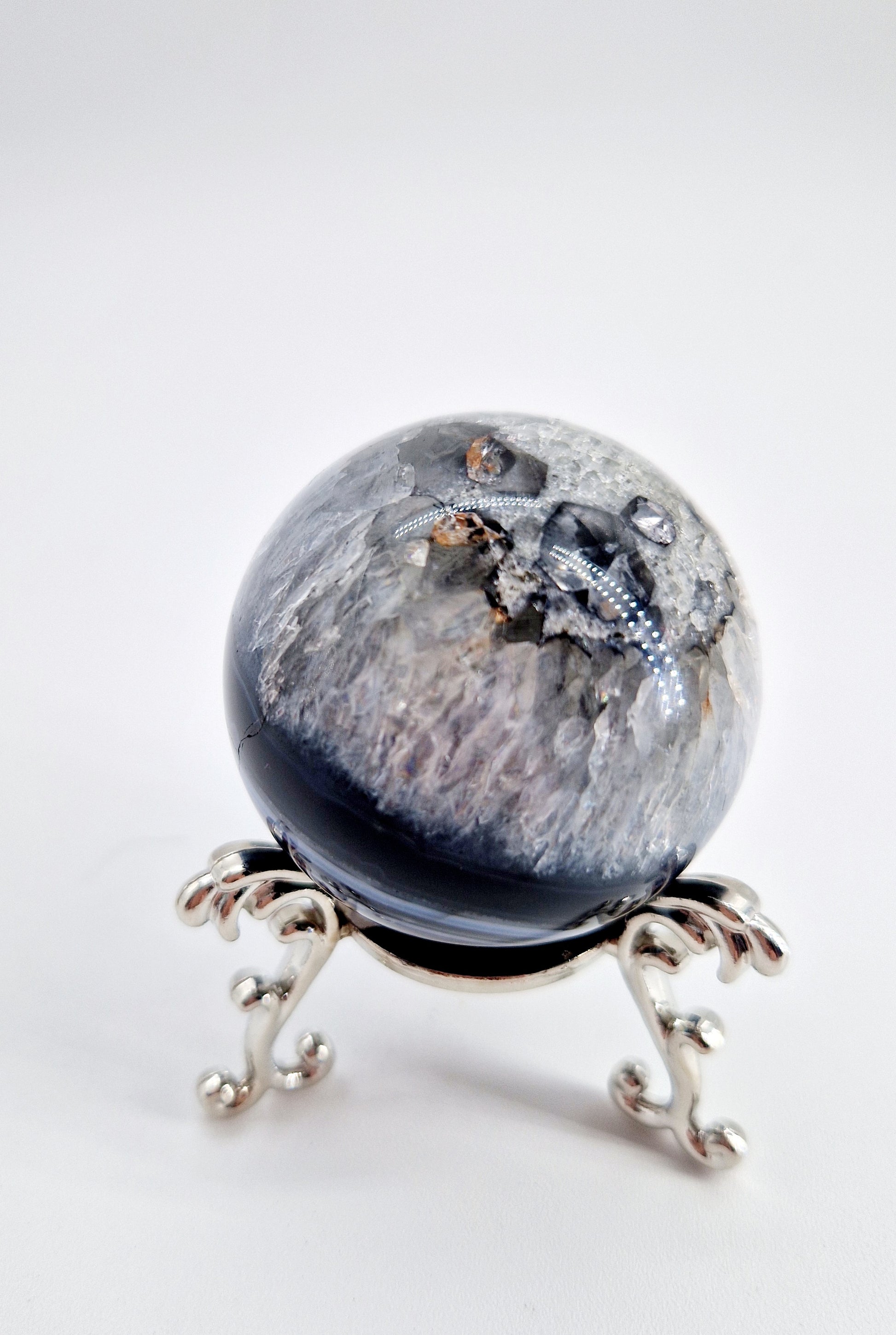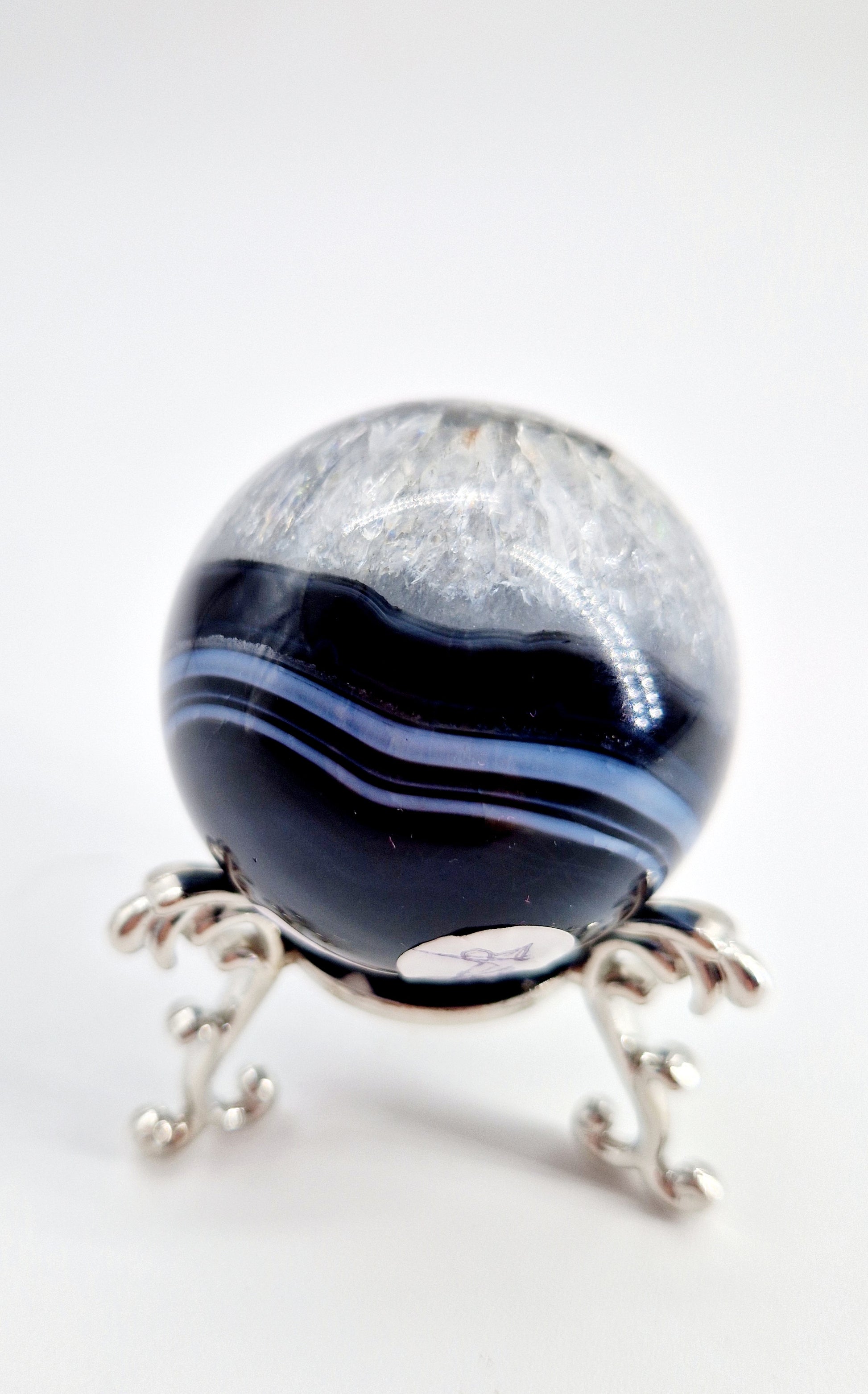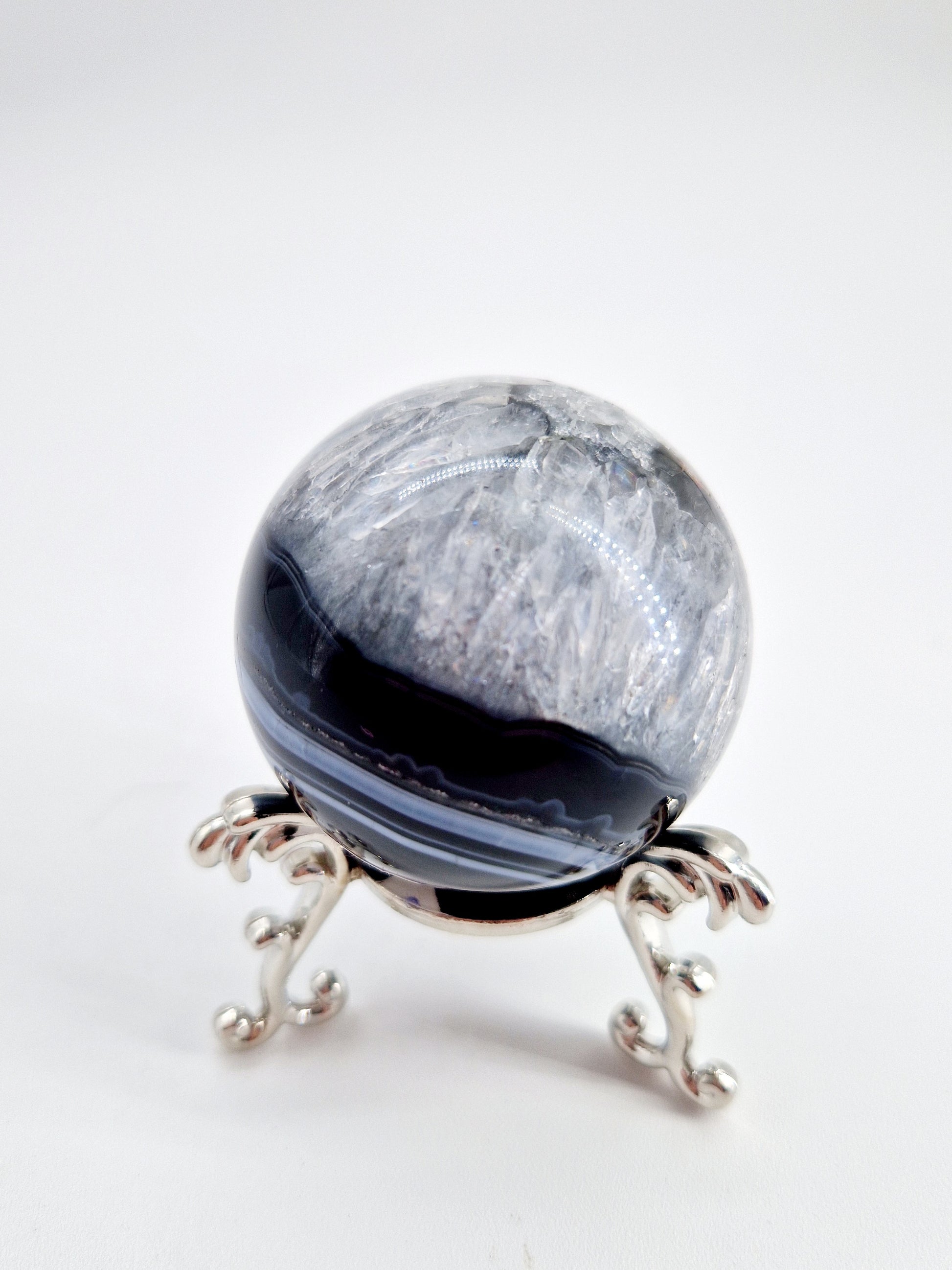 Discover the harmonious balance of black agate and quartz in this unique sphere. This stone promotes grounding, clarity, and energy amplification. Perfect for home décor or as a gift.